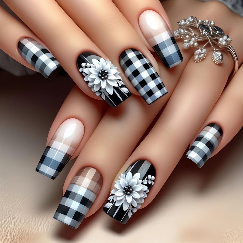 Featuring a glossy black & white checkered pattern combined with delicate daisy flower designs, these nails perfectly balance edgy and feminine vibes.