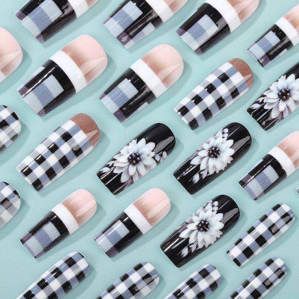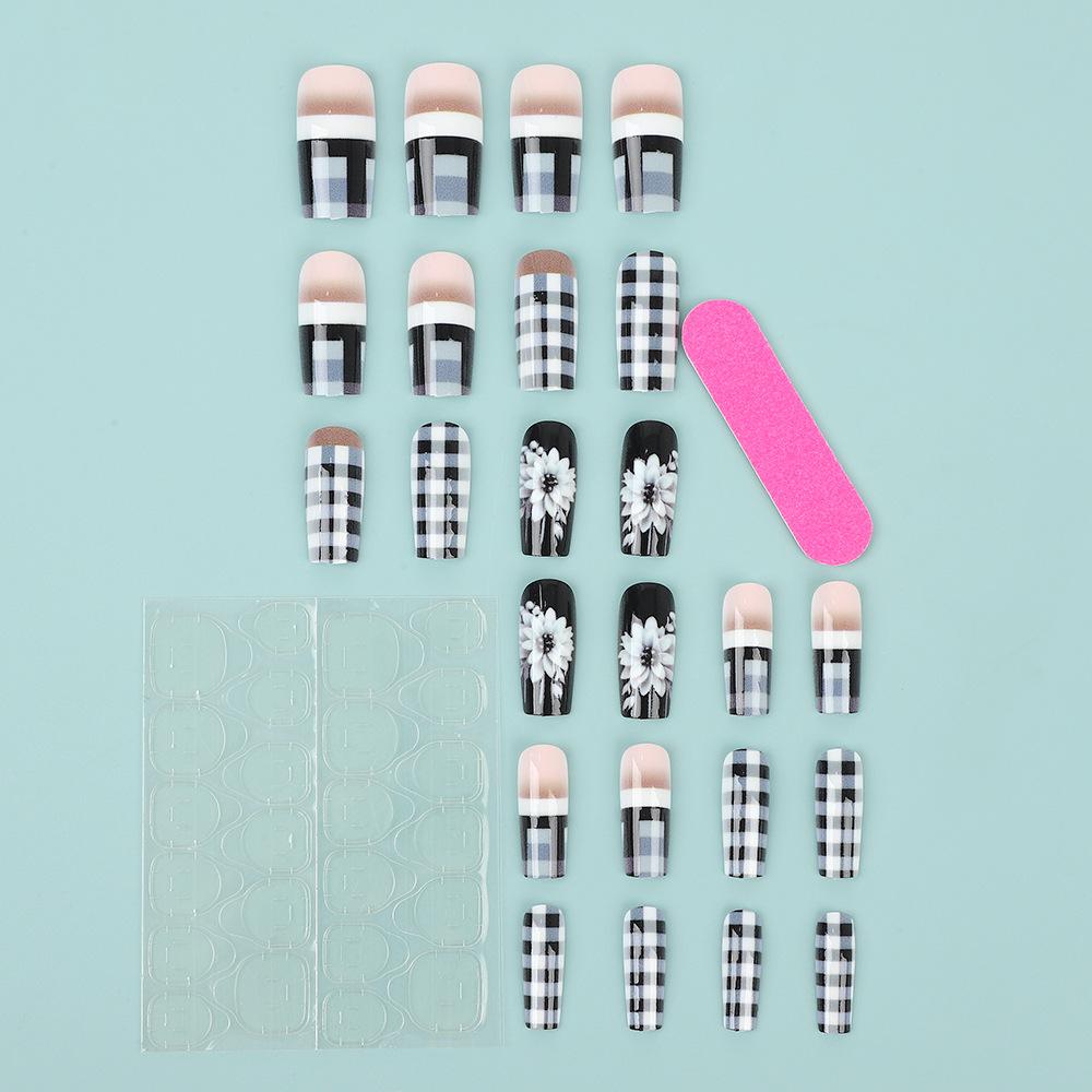 | Name | 24pcs Long Square Press-On Nails–Glossy Black & White Checkered |