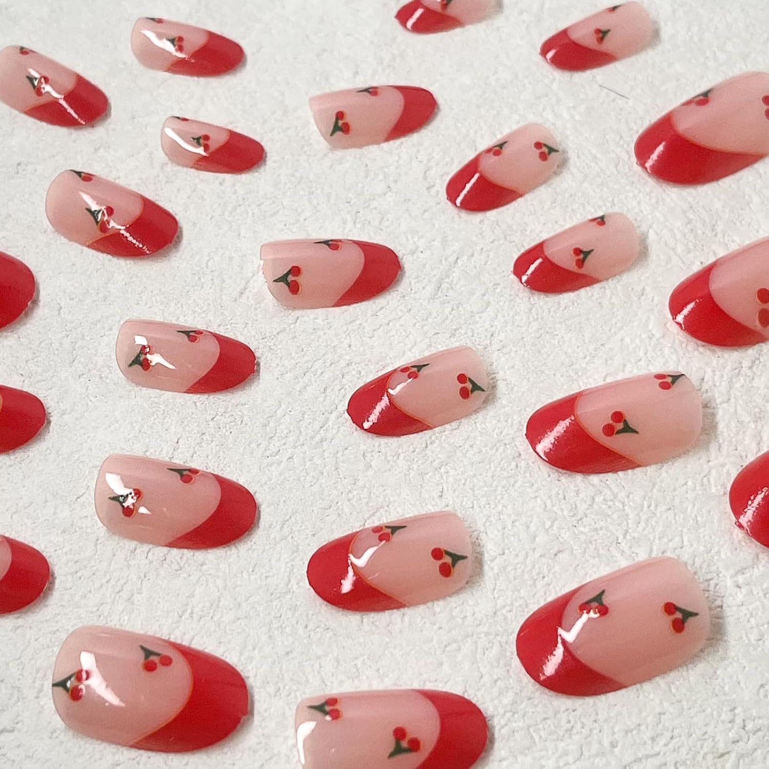 | Name | 24pcs Glossy Red Almond Press-On Nails–Short French Cherry Blossom Design |